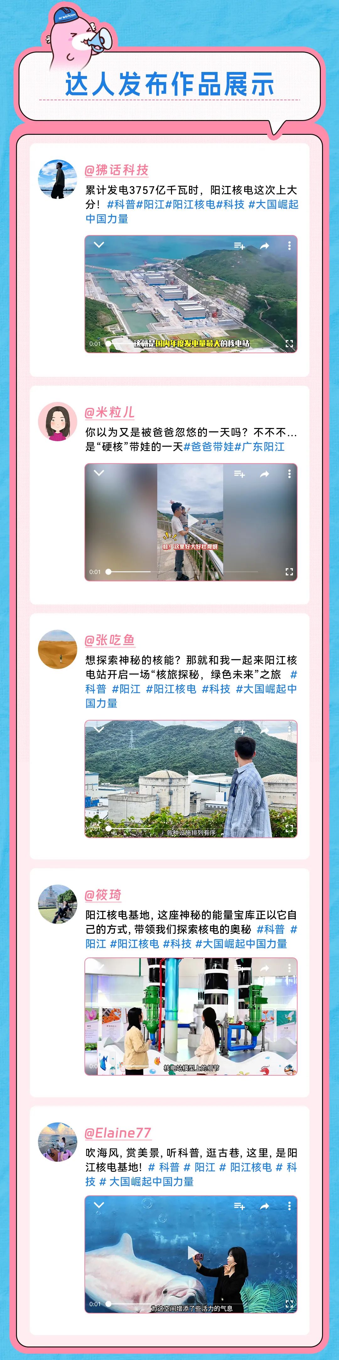 此次活動獲得達人紛紛點贊,并結合探訪實際情況開展了一系列創(chuàng)作,展示陽江核電的風采,讓更多人了解清潔能源的發(fā)展。