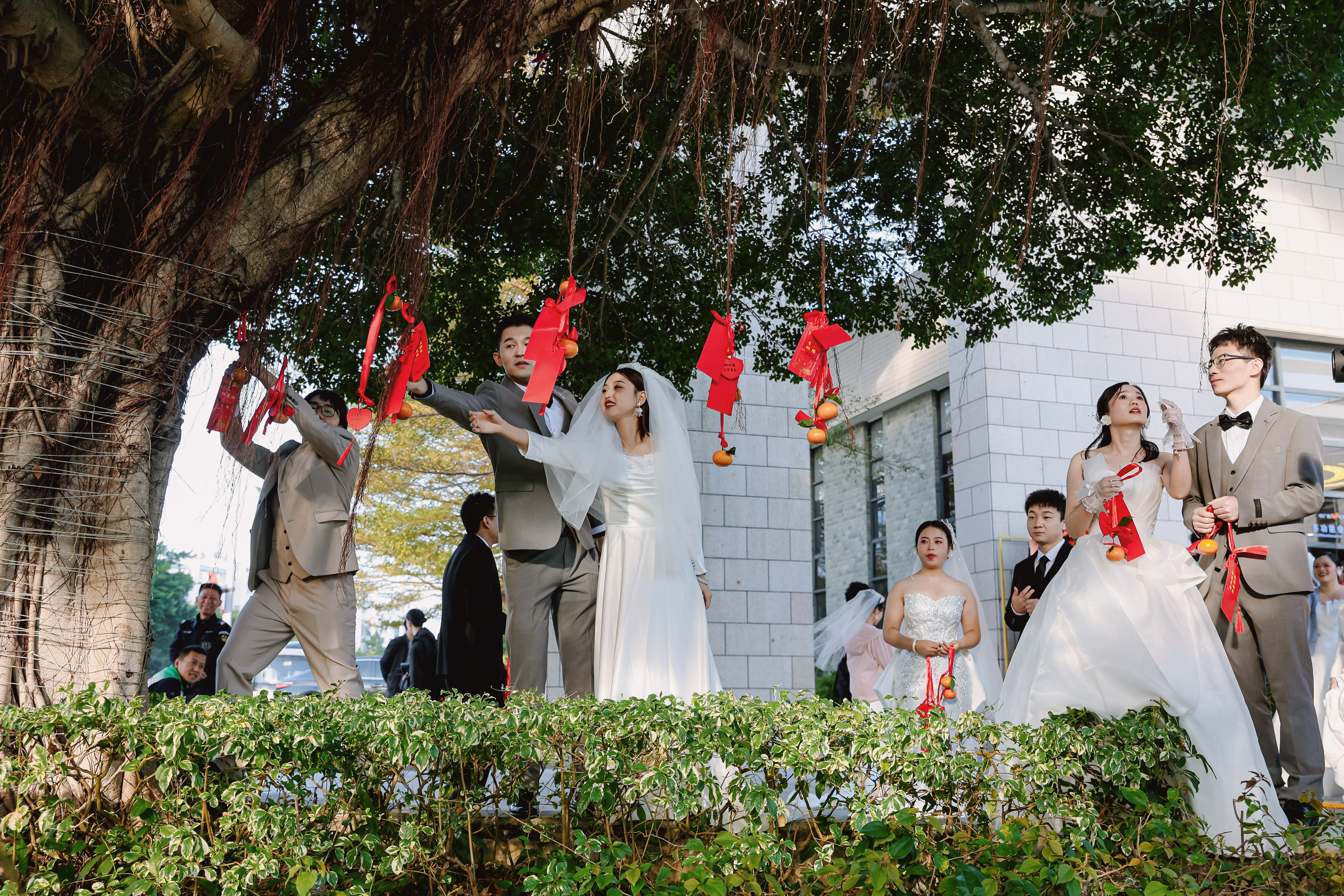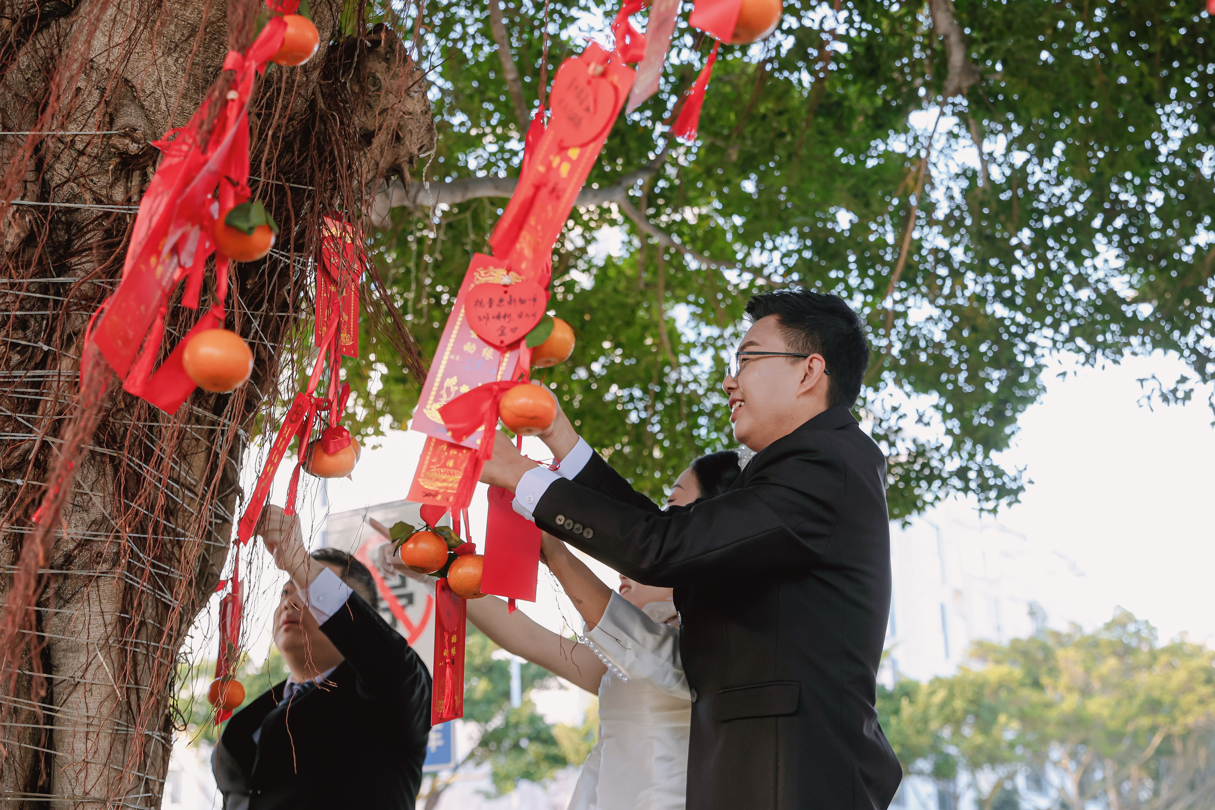 新人們?cè)陉?yáng)江核電生活區(qū)海濱花園同心樹(shù)下,系上祈福帶,許下與愛(ài)情美好的愿望,他們一同用力,將許愿球拋向空中,落在同心樹(shù)的枝葉間,新人們的浪漫愛(ài)情仿佛被大樹(shù)溫柔地接納與守護(hù),綠蔭如蓋,茂盛的樹(shù)桿上掛滿(mǎn)了新人寫(xiě)的愛(ài)情祈福綢帶。