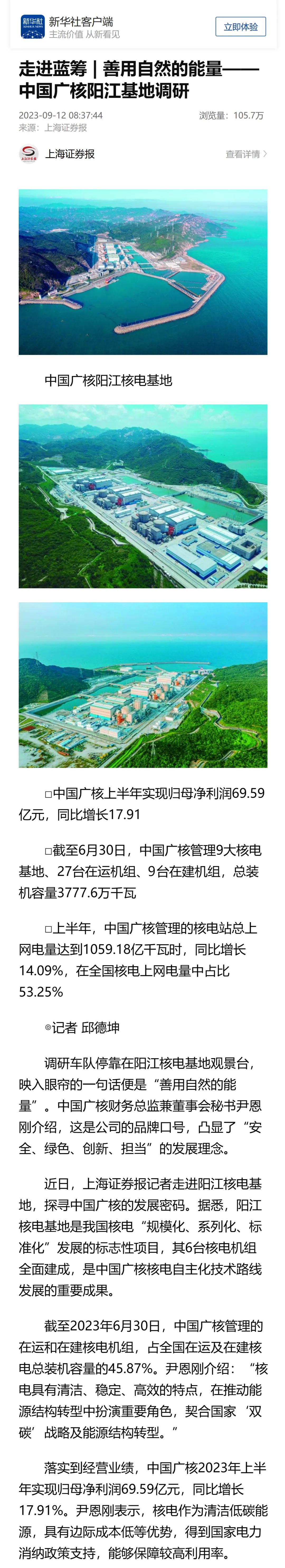 落實到經(jīng)營業(yè)績,中廣核2023年上半年實現(xiàn)歸母凈利潤69.59億元,同比增長17.91%。尹恩剛表示,核電作為清潔低碳能源,具有邊際成本低等優(yōu)勢,得到國家電力消納政策支持,能夠保障較高利用率。