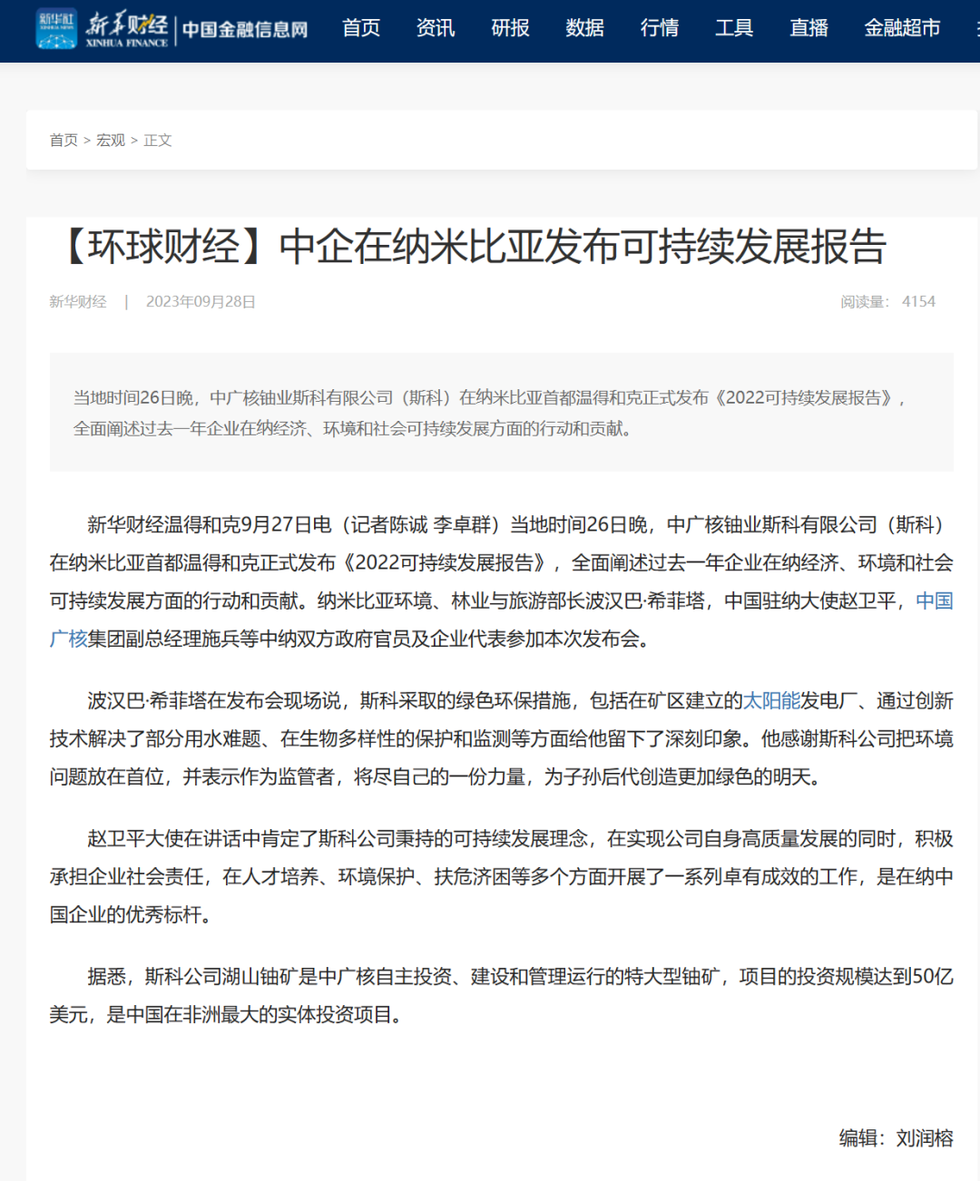 納米比亞當(dāng)?shù)貢r(shí)間9月26日晚,中廣核鈾業(yè)斯科有限公司在納米比亞首都溫得和克舉辦2022年可持續(xù)發(fā)展報(bào)告發(fā)布會(huì),這是斯科公司連續(xù)第四年發(fā)布可持續(xù)發(fā)展報(bào)告,新華社對(duì)此進(jìn)行了聚焦報(bào)道。