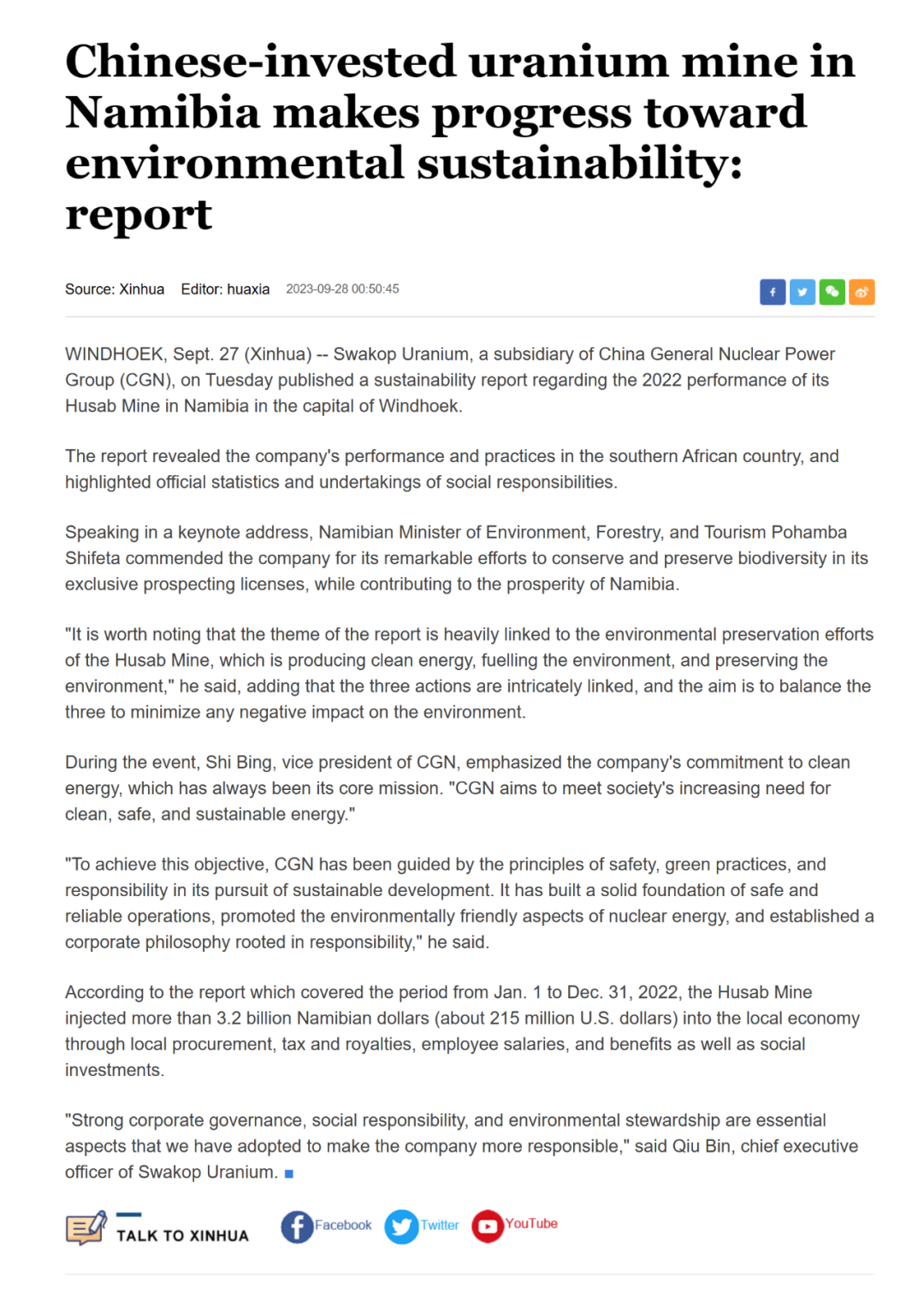 WINDHOEK, Sept. 27 (Xinhua) -- Swakop Uranium, a subsidiary of China General Nuclear Power Group (CGN), on Tuesday published a sustainability report regarding the 2022 performance of its Husab Mine in Namibia in the capital of Windhoek.