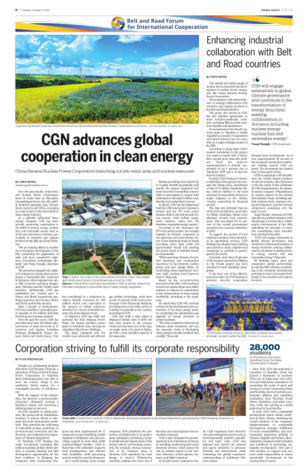 10月17日,《中國(guó)日?qǐng)?bào)》刊發(fā)專版報(bào)道,多角度講述中廣核高質(zhì)量共建“一帶一路”清潔能源產(chǎn)業(yè)生態(tài)圈,履行海外社會(huì)責(zé)任,支持和促進(jìn)可持續(xù)發(fā)展等背后的故事。