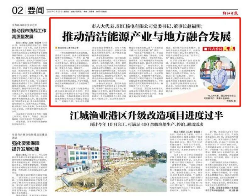 “清潔能源領(lǐng)域的高質(zhì)量發(fā)展,需要在產(chǎn)業(yè)協(xié)同、技術(shù)引領(lǐng)和融合發(fā)展等方面持續(xù)發(fā)力。”作為一名“核電人”和市人大代表,公司黨委書記、董事長趙福明表示以高質(zhì)量清潔能源建設(shè)推動高質(zhì)量發(fā)展需要久久為功、持續(xù)作為。2月20日,《陽江日報》刊出相關(guān)報道,報道全文如下:
